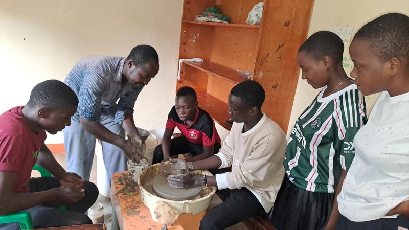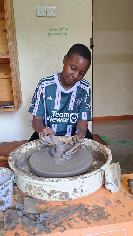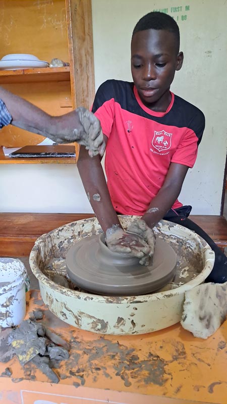 Weiterhin haben die Kinder viel von den Angeboten in den Musik- und Kunstworkshops und natürlich auf dem Sportplatz. Als Gastlehrer hatten wir einen Keramik-Künstler, der über mehrere Tage die Kinder mit der Dreh Töpferscheibe vertraut gemacht hat. Unser Ziel ist ja, den Kindern möglichst vielfältige praktische „skills“ näher zu bringen, denn ein Studium an der Uni ist für uns weder bezahlbar noch lohnend. Zu viele Uni Absolventen stehen in Uganda auf der Straße.